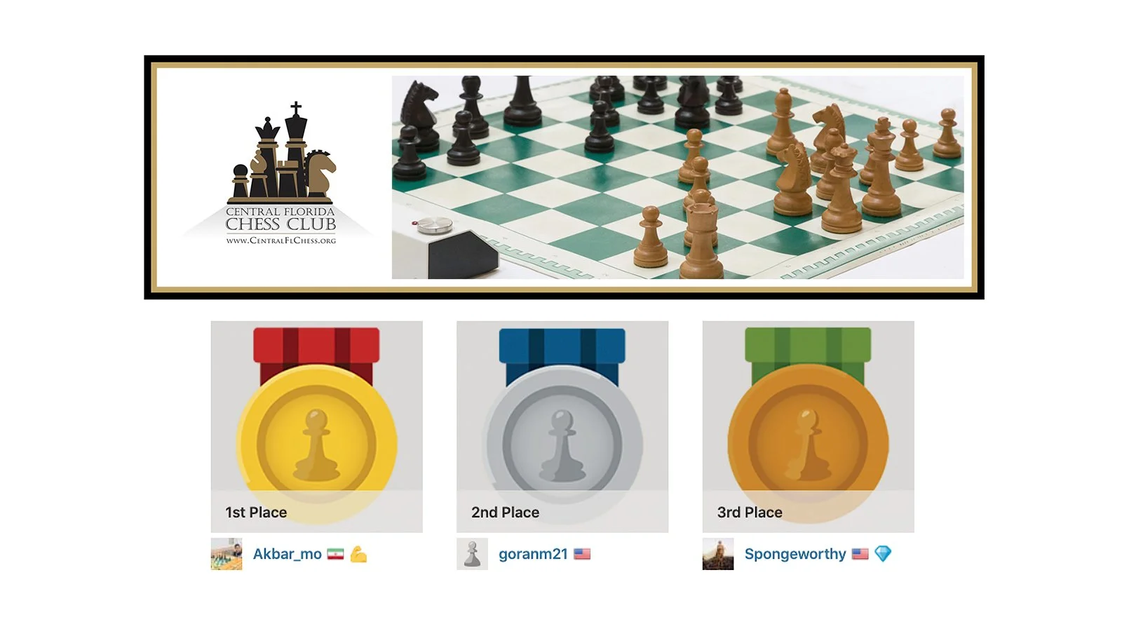 Congratulations to Sina Movahed (Akbar_mo) for winning clear 1st place in Saturday’s (5/28) rapid tournament with a score of 3.5/4 points and a prize payout of $44, while Goran Markovic (goranm21) and Mike Mason (Spongeworthy) tied for 2nd/3rd place with 3/4 points and a prize of $22 ea.